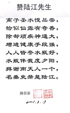 凡尊重中國(guó)古代養(yǎng)生智慧的患者,堅(jiān)持“已饑方食”和定時(shí)主動(dòng)補(bǔ)水者,均可祛病康復(fù)。如牡丹江醫(yī)學(xué)院87歲的張鵬圖飲用半年后高血壓未痊愈,陸江與他通話交流,了解他原先每日主食4兩,建議他用“已饑方食”減少主食肉食量,他理解后,將每日主食減為3兩,少吃兩塊肉,飲用一年治愈26年的冠心病和高血壓。他2003年5月31日來(lái)信說(shuō):“飲用卓康小分子團(tuán)水是根治高血壓、冠心病、糖尿病的一把金鑰匙,是填補(bǔ)醫(yī)學(xué)空白,為人類造福,應(yīng)推廣該產(chǎn)品。”