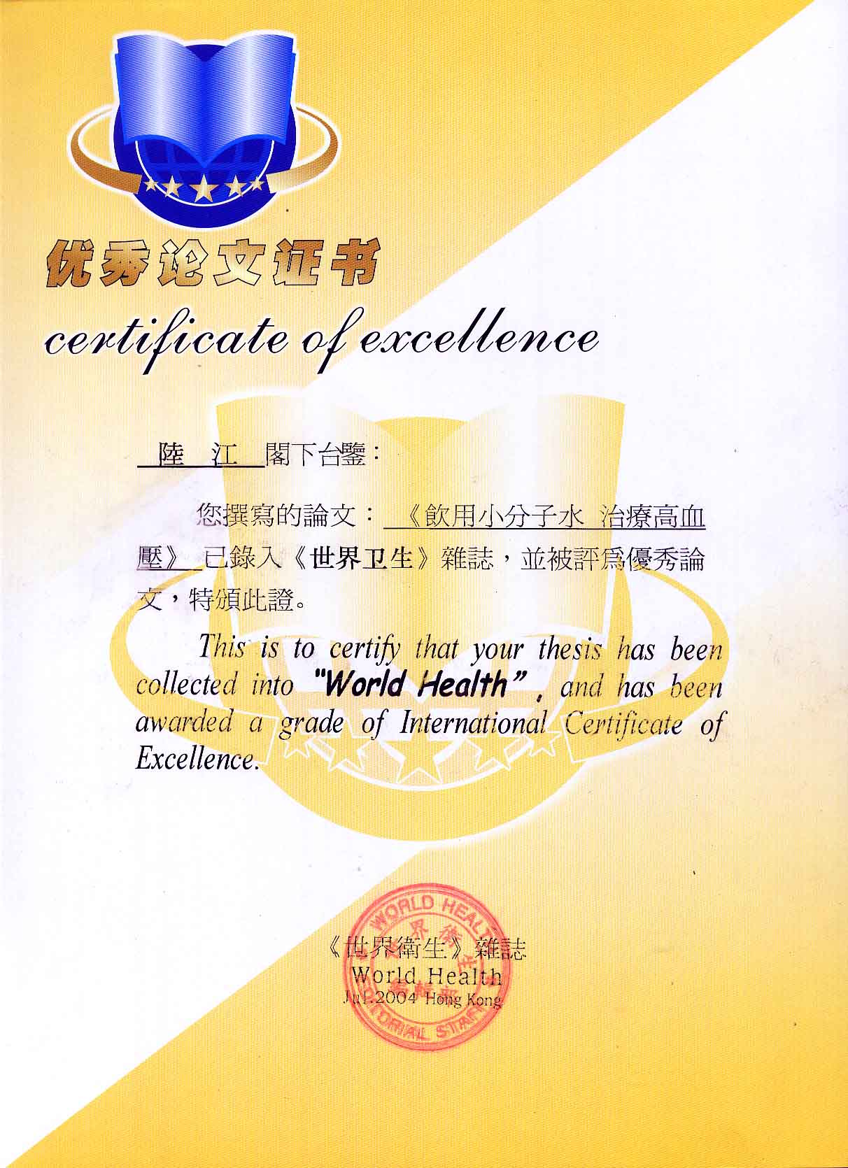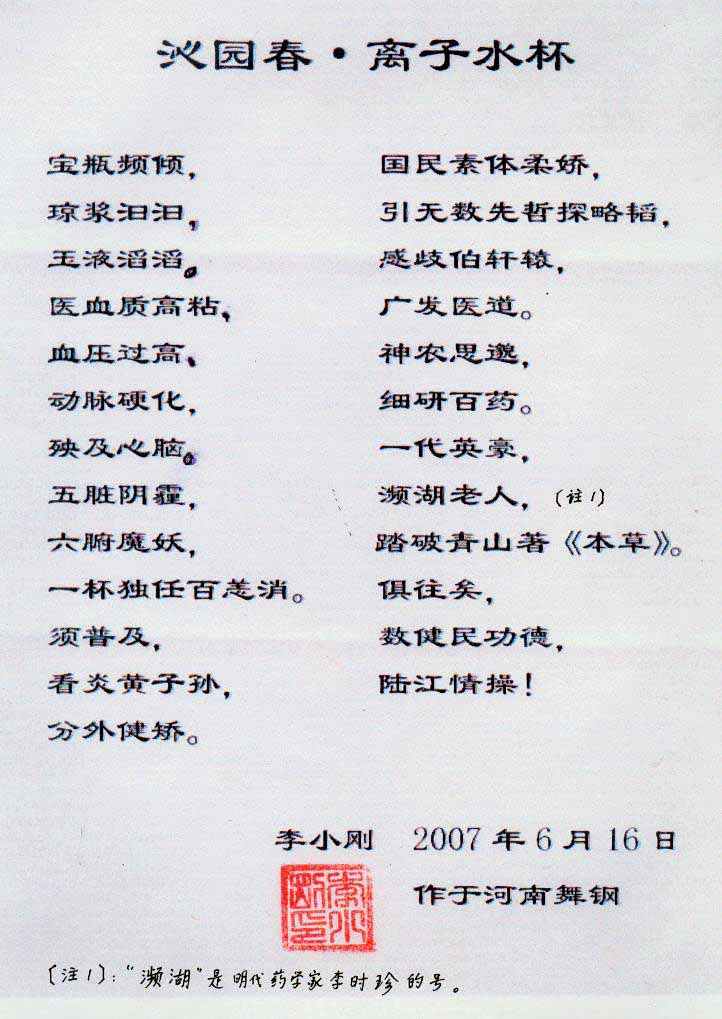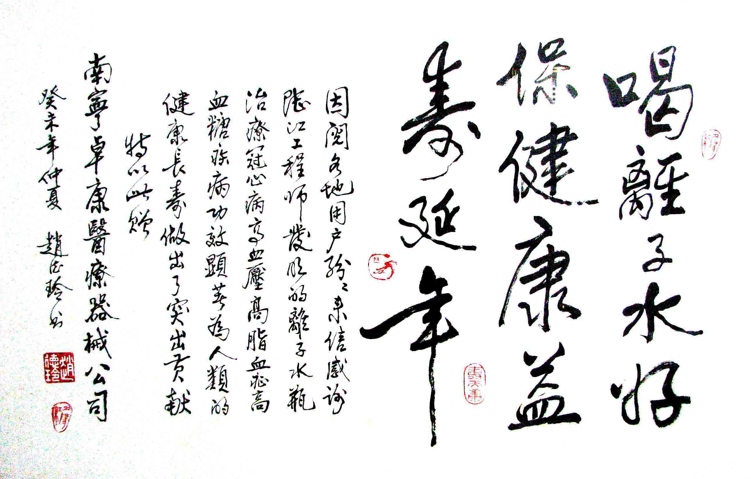-----我是從事建筑的高工,本來(lái)沒(méi)有資格去攻克醫(yī)學(xué)難題,卻為了自身健康才扣響醫(yī)學(xué)的大門。由于我1990年患高血壓,因怕中風(fēng)才研究發(fā)明了離子水瓶,我把水處理成微小分子團(tuán)水,飲用后治愈了高血壓。便于1993年底送到三家省級(jí)醫(yī)院做臨床試用4個(gè)月。經(jīng)北京和廣西醫(yī)學(xué)專家鑒定:"降脂降壓效果好"," 能擴(kuò)大心腦動(dòng)脈流量,改善心腦電圖以及微循環(huán)","對(duì)治療心腦動(dòng)脈粥樣硬化、高血壓、高血脂有良好的醫(yī)療保健作用。""產(chǎn)品的技術(shù)性能和療效達(dá)到了同類產(chǎn)品的國(guó)內(nèi)領(lǐng)先水平,經(jīng)廣西醫(yī)學(xué)科學(xué)情報(bào)研究所檢索,未見國(guó)外有類似報(bào)道。"中國(guó)醫(yī)學(xué)科學(xué)院張正國(guó)教授從美國(guó)國(guó)立醫(yī)學(xué)圖書館數(shù)據(jù)庫(kù)存Medline檢索英俄文資料,均未見類似報(bào)告。2000年上市后,我為了對(duì)消費(fèi)者負(fù)責(zé)而繼續(xù)觀察研究,一直通過(guò)《信譽(yù)卡》和《質(zhì)量跟蹤調(diào)查書》向患者承諾療效,請(qǐng)用戶使用6個(gè)月后反饋效果。和脂壓患者飲用2至5個(gè)月內(nèi),消除癥狀,停服藥物,血壓正常;冠心病患者飲用3~5個(gè)月逐漸減輕至消除心絞痛、房顫等癥狀,不再服藥,飲用1年左右心電圖正常,經(jīng)冠脈造影掃描無(wú)明顯狹窄,表明冠心病痊愈。大量患者還反映許多衰弱器官被修復(fù),讓前列腺增生、慢性咽喉炎、慢性氣管炎、支氣管炎、慢性胃炎、腸炎和膽囊炎等不藥而愈;2型糖尿病患者是因?yàn)橐葝u衰弱致病,飲用該水半年至一年,逐漸減藥至停藥,血糖尿糖正常,真正治愈2型糖尿病。中風(fēng)后遺癥患者飲用六七個(gè)月,可逐漸減輕至消除肢體和語(yǔ)言障礙,表明飲用該水能讓壽命很長(zhǎng)的神經(jīng)元細(xì)胞逐漸修復(fù),奇跡般地恢復(fù)肢體和語(yǔ)言功能。飲用后還使胸腺和脾臟兩個(gè)重要的免疫器官被修復(fù)和增強(qiáng),產(chǎn)生免疫細(xì)胞多,提高了免疫力,使人不生病或少生病。自此, 飲用微小分子團(tuán)水創(chuàng)造了攻克冠心病、高(低)血壓和糖尿病三大醫(yī)學(xué)難題的奇跡。人們對(duì)此感到不可思議,但實(shí)踐是檢驗(yàn)真理的唯一標(biāo)準(zhǔn)。