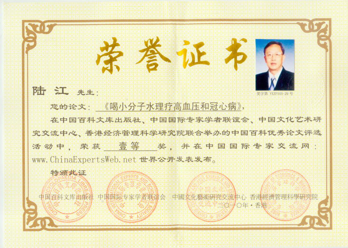 人類幾千年來(lái)患以上病癥需終生服藥,幾十年也不能治愈。可是我國(guó)南寧的高級(jí)工程師陸 江,于1990年想根治高血壓,研究發(fā)明了離子水瓶,處理出微小分子團(tuán)水供飲用,經(jīng)過(guò)醫(yī)院臨床試用和專家鑒定,1999年獲中國(guó)發(fā)明專利權(quán),產(chǎn)品于2000年投放市場(chǎng)后一直跟蹤調(diào)查,據(jù)全國(guó)各地用戶反饋:祛除了高低血壓、糖尿病和冠心病,并使前列腺增生、咽喉炎、鼻竇炎、慢性氣管炎、支氣管炎、矽肺病、哮喘、慢性胃炎、腸炎、慢性膽囊炎、慢性腎炎、腎衰、膀胱炎、便秘、痔瘡、風(fēng)濕性關(guān)節(jié)炎和濕疹皮炎及中風(fēng)后遺癥等病癥不藥而愈。為什么喝微小水能治20多種病?陸 江從1991年德國(guó)科學(xué)家發(fā)現(xiàn)細(xì)胞膜水通道僅為2納米獲得啟發(fā),認(rèn)為多種器官患病是因細(xì)胞脫水,不能正常代謝和分裂增殖,才使器官細(xì)胞減少致衰弱萎縮而形成細(xì)胞缺水性病癥。22年來(lái)的實(shí)踐有力地支持了“細(xì)胞脫水致病”這一重要論點(diǎn),表明喝微小水可滿足細(xì)胞的生理需求,補(bǔ)水就能祛病,是生命科學(xué)新亮點(diǎn)。