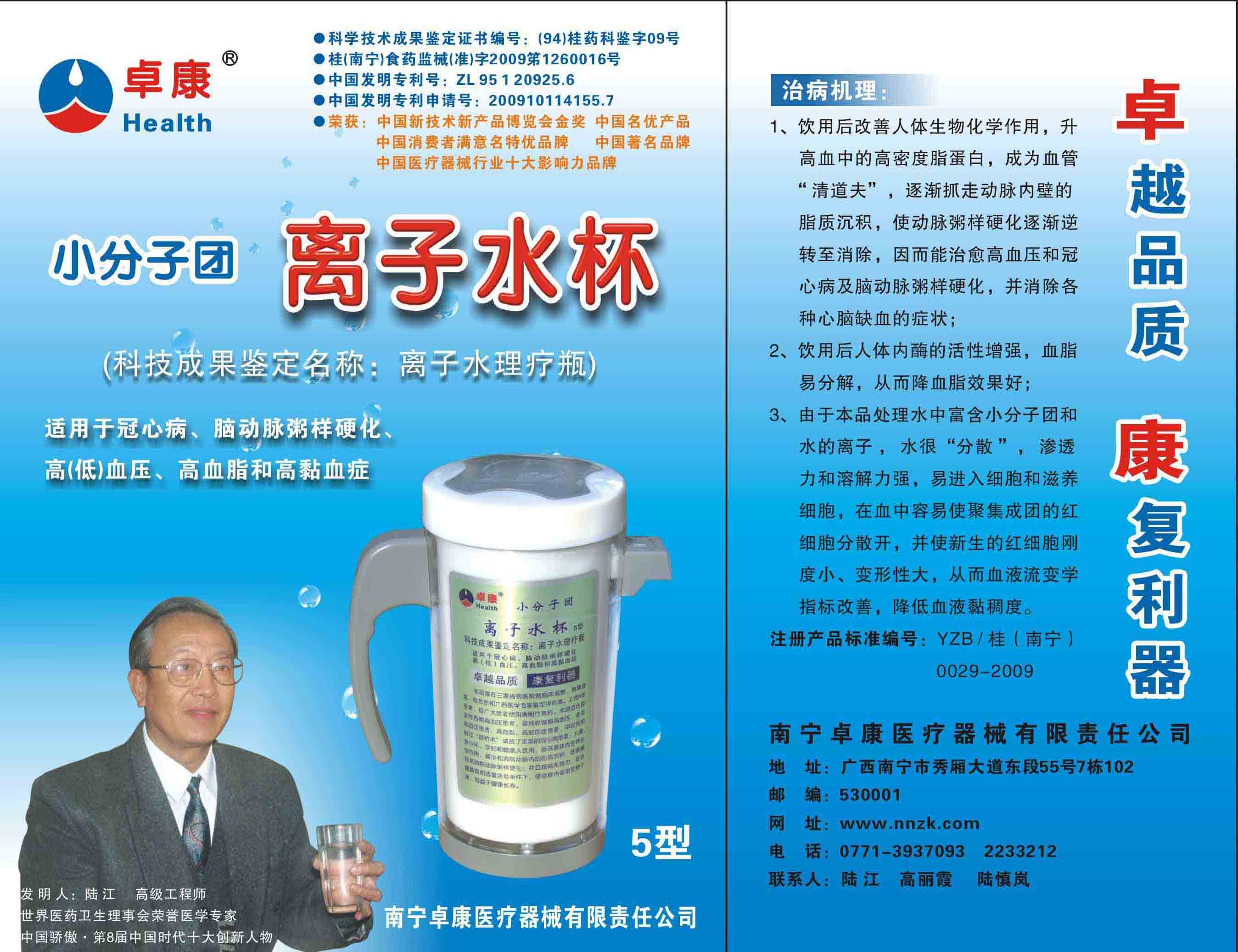 本品大量用戶的使用效果表明,能治愈冠心病、腦動(dòng)脈硬化、原發(fā)性高(低)血壓、高血脂、高粘血癥、高血尿酸癥(痛風(fēng))和2型糖尿病、衰弱器官并發(fā)癥(前列腺增生、腎衰與尿毒癥)及中風(fēng)后遺癥等療效好。產(chǎn)品配信譽(yù)卡。使用壽命30年,不換芯,易清洗。團(tuán)購(gòu)優(yōu)惠。從郵局匯款,匯費(fèi)1%,地址按本頁(yè)下方地址、聯(lián)系人寫。從銀行匯款,請(qǐng)點(diǎn)擊[聯(lián)系匯款]欄,從工商銀行匯款,建設(shè)銀行、農(nóng)業(yè)銀行匯款,均免收匯費(fèi),匯款后20--30分鐘內(nèi)發(fā)短信,可用微信轉(zhuǎn)帳,均免匯費(fèi),微信號(hào)即手機(jī)號(hào)13768308380。匯款后,告知你的姓名和地址,我公司聯(lián)系人手機(jī)號(hào)是:13768308380。卓康牌離子水瓶為我公司獨(dú)家生產(chǎn),郵購(gòu)產(chǎn)品配《補(bǔ)水的大智慧》彩印書一本,另配四季出版社出版的新書《補(bǔ)水的大智慧》一本,并配光盤一張(含央視主持人釆訪陸江的對(duì)話視頻)。目前市場(chǎng)和"淘寶網(wǎng)"上有人兜售假冒的偽品,望讀者審察辯別真?zhèn)危旒僬哓飧`假冒本公司的各種認(rèn)證、獲獎(jiǎng)獎(jiǎng)項(xiàng)、專利號(hào)和外包裝盒上的中英文字,包括科技成果的鑒定意見等,請(qǐng)讀者注意防偽。如何識(shí)別假貨?已經(jīng)買了假貨怎么辦?(請(qǐng)點(diǎn)擊[打假掠影][打假掠影])。